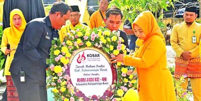 PANGKALAN BUN, PROKALTENG.CO – Menjelang peringatan Hari Jadi ke-66 Kabupaten Kotawaringin Barat (Kobar), jajaran pemerintah daerah melaksanakan ziarah ke makam para pendiri, Kamis (2/10). Upacara yang dipimpin langsung Bupati Kobar Hj Nurhidayah itu berlangsung khidmat dengan balutan busana adat Kotawaringin.