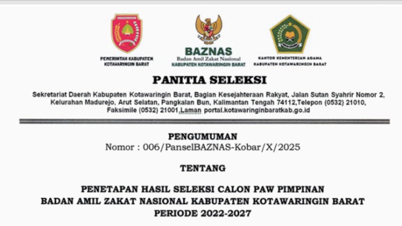 PANGKALAN BUN, PROKALTENG.CO – Pemerintah Kabupaten Kotawaringin Barat (Kobar) melalui Panitia Seleksi Calon Pengganti Antar Waktu (PAW) Pimpinan Badan Amil Zakat Nasional (BAZNAS) resmi mengumumkan hasil seleksi calon pimpinan periode 2022–2027. Pengumuman ini tertuang dalam surat keputusan nomor: 006/PanselBAZNAS-Kobar/X/2025 tentang penetapan hasil seleksi dan nomor: 007/PanselBAZNAS-Kobar/X/2025 tentang uji publik hasil seleksi calon PAW pimpinan BAZNAS.