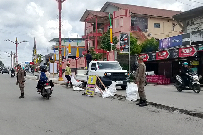 PURUK CAHU,PROKALTENG.CO – Satuan Polisi Pamong Praja (Satpol PP) Kabupaten Murung Raya ikut melakukan pengamanan dan pengaturan lalu lintas di jalan Ahmad Yani simpang Pulo Basan. Pasalnya di lokasi itu, sedang dilakukan pembangunan median jalan atau penutupan total oleh Dinas Pekerjaan Umum dan Penataan Ruang, karena sering terjadi kecelakaan.