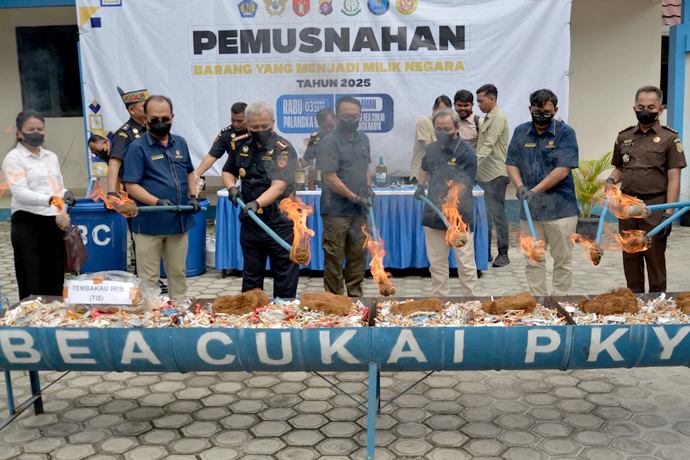 Dia menjelaskan bahwa barang yang dimusnahkan terdiri dari rokok ilegal tanpa cukai sebanyak 227.436 batang, tembakau iris ilegal 10.000 gram, dan minuman keras (miras) mengandung etil alkohol (MMEA) ilegal termasuk alkohol oplosan sebanyak 368,25 liter.