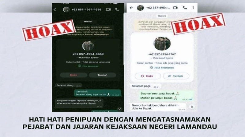 “Kami mengimbau kepada seluruh OPD dan instansi terkait untuk selalu berhati-hati dan melakukan konfirmasi terlebih dahulu jika ada nomor baru yang mengatasnamakan pejabat Kejaksaan. Jangan ragu untuk menghubungi Kejaksaan Negeri Lamandau secara langsung untuk memastikan kebenarannya,” tegas Angga.