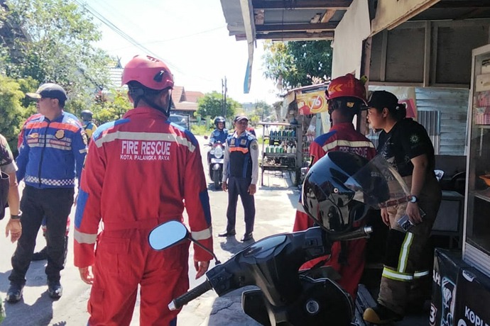 Petugas pemadam saat menindaklanjuti laporan penyambaran gas di warung Jalan Lawu, Kota Palangka Raya, Selasa (7/10). (DPKP)