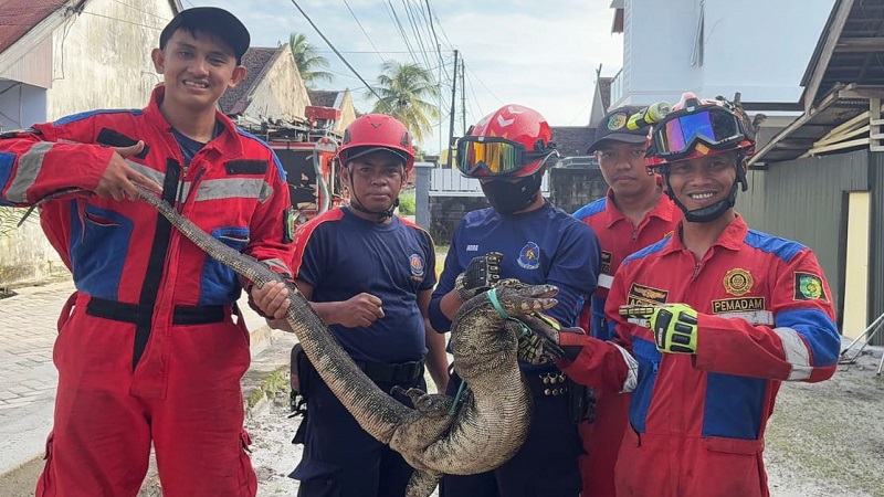 PALANGKA RAYA, PROKALTENG.CO- Seekor biawak berukuran lebih dari satu meter berhasil dievakuasi Tim Rescue Dinas Pemadam Kebakaran dan Penyelamatan (DPKP) Kota Palangka Raya, setelah masuk ke pekarangan rumah warga di Jalan Mujair, Minggu (7/12/2025).