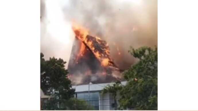 Kobaran api melalap habis lantai dua bangunan. Menurut keterangan sejumlah saksi, sebelum api berkobar sempat terdengar suara ledakan dari bagian atap gedung. Ledakan tersebut diduga berasal dari arus pendek listrik. Tak lama kemudian, kobaran api cepat membesar hingga menghanguskan sebagian besar ruangan di lantai atas.