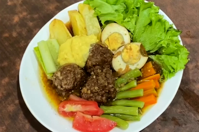 Siapkan piring, tata selada, wortel rebus, buncis, kentang goreng, timun, dan tomat. Tambahkan bola daging dan telur pindang. Siram dengan kuah gurih dan beri mustard Jawa di atasnya.