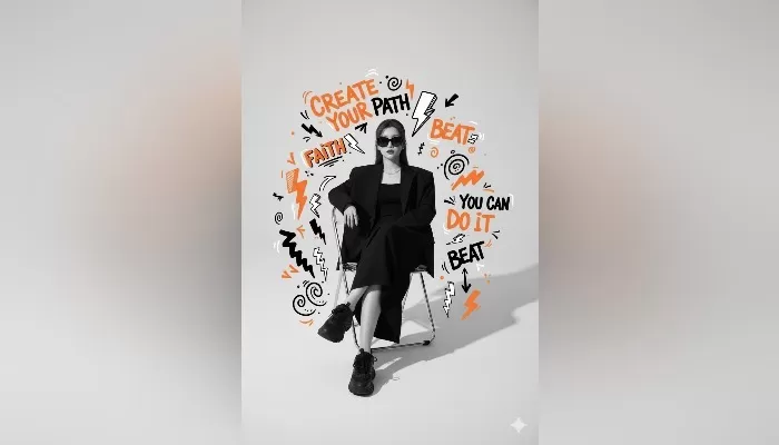 “Ultra-realistic black and white studio portrait, vertical 9:16. A young person striking a pose while sitting on a simple folding chair, wearing an oversized black blazer, black shirt, long skirt, and thick sneakers. Relaxed posture, crossed legs, one hand resting on the chair, wearing sunglasses, confident expression. Plain white studio background with soft studio lighting, a subtle shadow falling on the floor to the right. Around the subject, hand-drawn black, white, and orange doodle graffiti illustrations: lightning bolts, zigzag lines, swirls, arrows, and motivational words: ‘CREATE YOUR PATH’, ‘FAITH’, ‘BEAT’, ‘YOU CAN DO IT’. High-contrast design, clean monochrome subject with bright doodle highlights. Replace the face with the uploaded photo, maintain consistent facial details and accessories.”