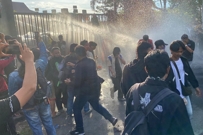 Polisi terpaksa menyemprotkan air untuk membuyarkan massa aksi di depan Mapolda Kalteng. (Foto Anandri/Prokalteng.co)